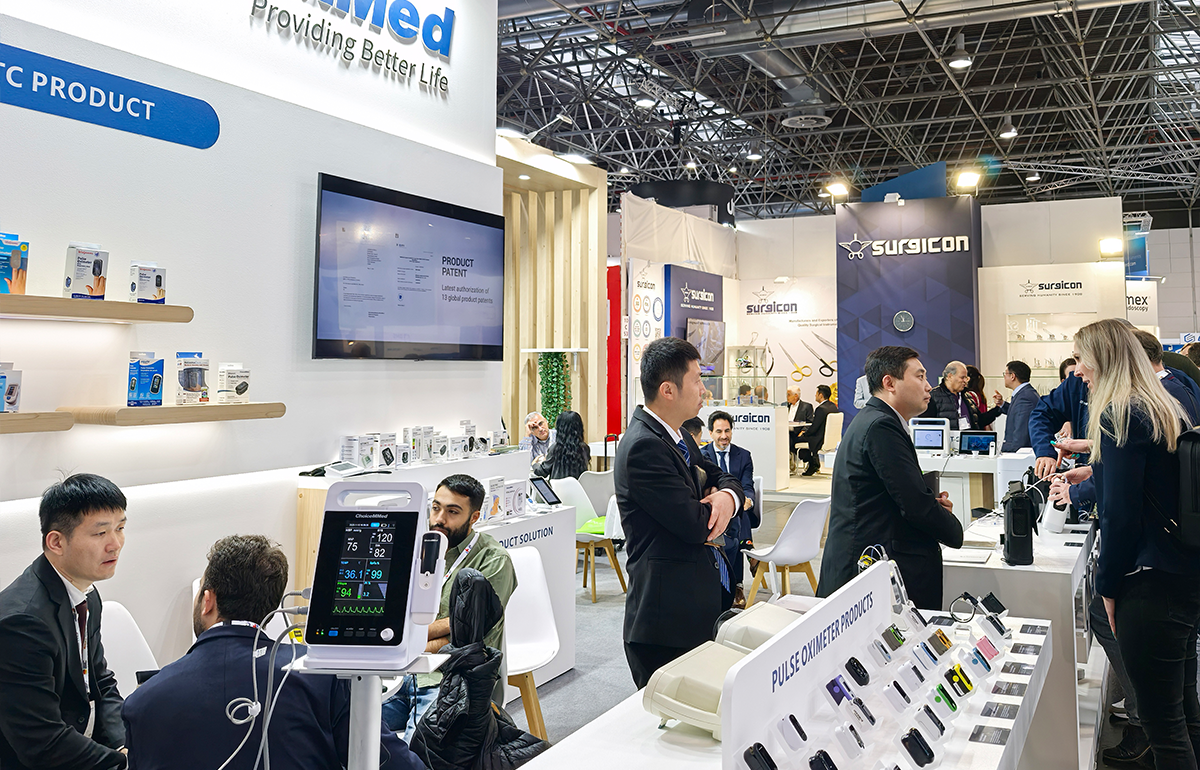 At this MEDICA exhibition,ChoiceMMed showcased multiple core products featuring innovative technologies,including pulse oximeters in various forms such as fingertip,handheld,wrist,and tabletop models,as well as innovative pulse oximetry products supporting Bluetooth and 4G remote transmission.Furthermore,ChoiceMMed highlighted its breakthrough achievements in quiet oxygen concentration technology.The newly upgraded intelligent medical oxygen concentrator operates at noise levels below 42 decibels and supports intelligent start/stop linkage with pulse oximeter products,which attracted a large number of professional visitors to stop and experience it.