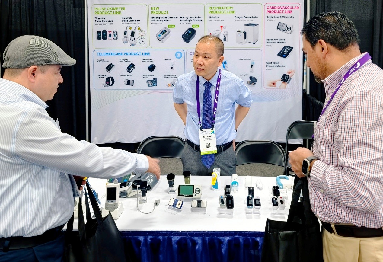 Responding to the growing demand for chronic disease management in North America, ChoiceMMed has developed a versatile range of portable and intelligent solutions tailored for various home environments. At its booth, the company presented a comprehensive oximetry ecosystem, including pediatric, fingertip, handheld, and wrist-worn models designed to meet the needs of diverse users. ChoiceMMed's medical-grade pulse oximeters became a center of attention at the exhibition, attracting numerous professional visitors with their non-invasive, precise SpO₂ monitoring suitable for all skin tones, as well as pulse rate and respiratory rate detection and arterial stiffness risk warning. Representatives from rehabilitation agencies and home care companies praised the devices, noting that such precision and intelligent functionality will significantly enhance the efficiency and safety of chronic disease management at home.